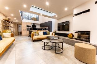 Living room/dining room with beautiful Retaise fireplace, fitted and equipped kitchen including a large "American" fridge-freezer.