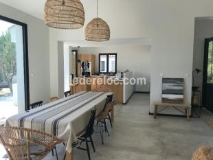 The villa, with over 200m² of living space, is all on one level, very bright, and offers high-end comfort, accommodating up to 12 people (8 adults). It consists of a main house, a large annex, and a second annex (only in July and August), allowing everyone to maintain their privacy while enjoying the pleasure of being together. The landscaped 860m² grounds, facing south and completely private, offer several relaxation areas, whether on the various terraces, under the covered area, or by the swimming pool (8x4m, secured by a roller shutter, heated from June to September). There are two bathtubs, and a high chair, baby bathtub, and travel cot for young children are available upon request. Main house 140m²: - large south-facing living room opening onto a large garden/pool terrace - fully equipped open-plan kitchen - 3 bedrooms (1 master bedroom with a 160x200 bed and adjoining dressing room, 1 bedroom with a 140x200 bed, 1 bedroom with 2 single beds (90x200cm) that can be pushed together - 1 bathroom (bath and shower) - 1 shower room - 2 separate toilets - dressing room. Annex (50m²): - 2 bedrooms (1 bedroom with a 160x200cm bed, 1 bedroom with 4 bunk beds), both opening onto the bathroom - games/TV room - bathroom - separate toilet. Annex (20m²), only available in July and August: - 1 bedroom (140x200cm bed) - bathroom with shower and toilet. Parking: 1 large carport for 1 car and bicycles. A children's playground and pétanque courts are a 5-minute walk away. Linens are provided (sheets, towels). Additional linens can be rented from our concierge. Pets are not allowed. Allowed.