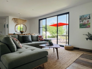 You will find a pleasant living room, bathed in light, with a fully equipped open kitchen, a large dining table, and a cozy living room with a sofa. A warm and functional space, perfect for cooking, chatting or simply getting together in all simplicity.