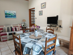 Furnished rental in Saint Martin de Ré, located 200 meters from shops and 150 meters from La Cible beach. It includes 2 bedrooms: 1 with a queen-size bed (160/200 cm) and 1 with a double bed (140/160 cm). There is a large living room, a fully equipped kitchen and lounge area with a sofa bed, TV, and Wi-Fi. A laundry room with a washing machine is also included. A covered terrace with garden furniture is provided. The property features a fenced courtyard and garden, parking for 2 vehicles, a bicycle storage area, and a barbecue.